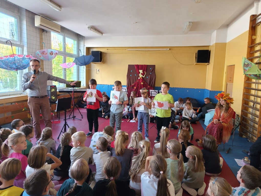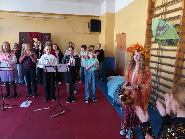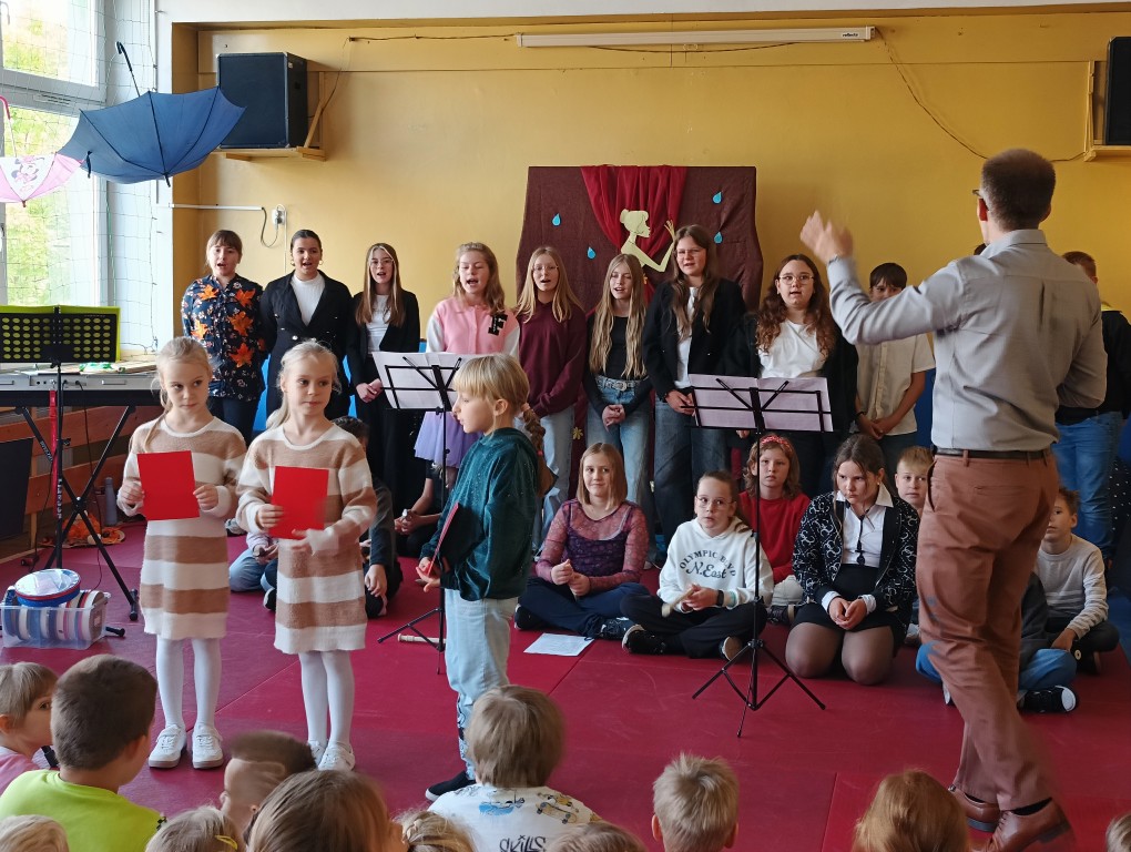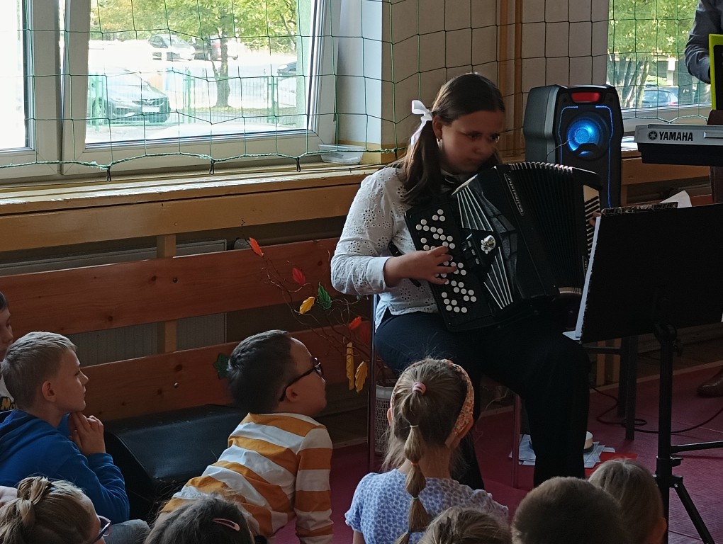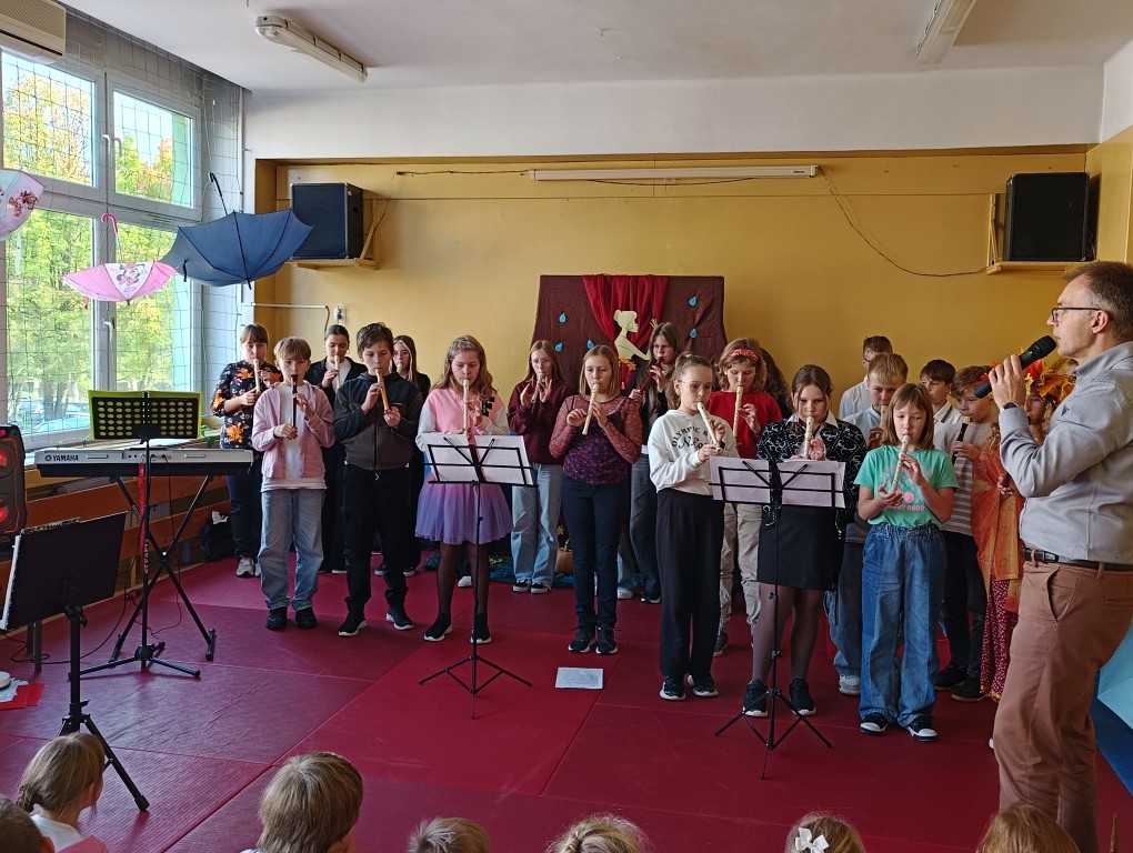 Wystąpili uczniowie klas 6 i 7 pod kierunkiem pana Tomasza Świercza. Młodsi uczniowie mieli okazję posłuchać piosenek, zatańczyć do rytmu polki oraz spróbować gry na bębenkach. Justyna z klasy 7a zaprezentowała utwory na akordeonie guzikowym, a zespół fletowy z towarzyszeniem organów wykonał kilka znanych melodii. Całe wydarzenie było pełne energii i radości — to była naprawdę udana audycja!