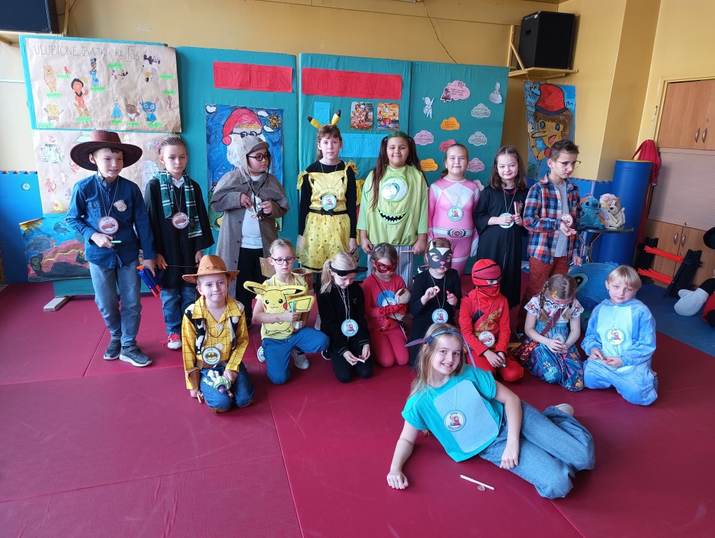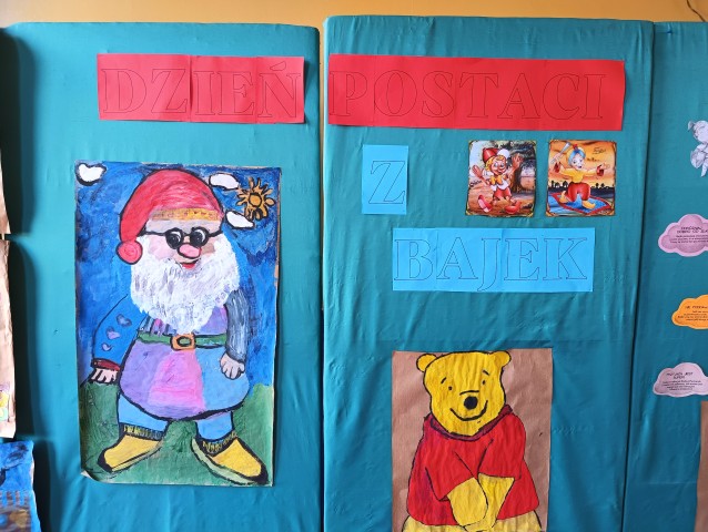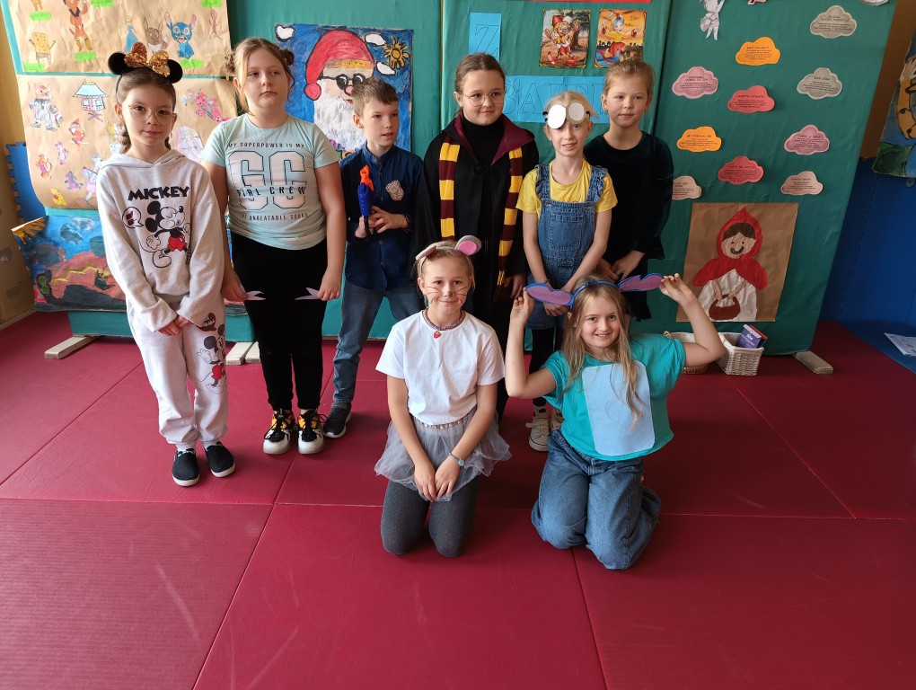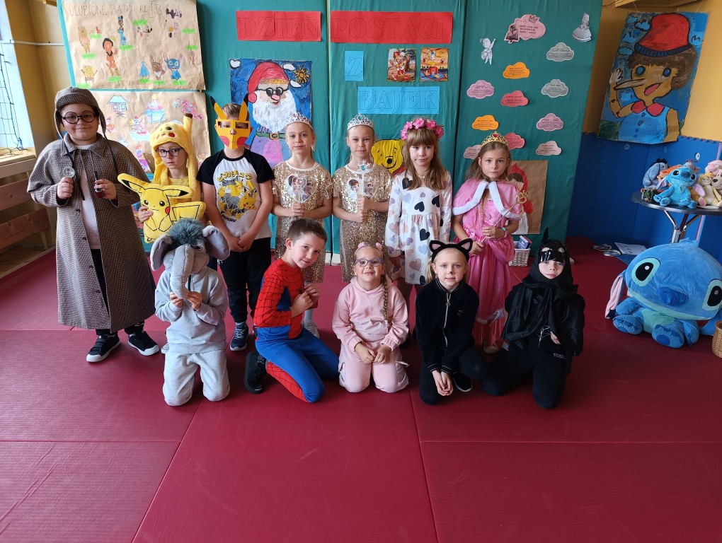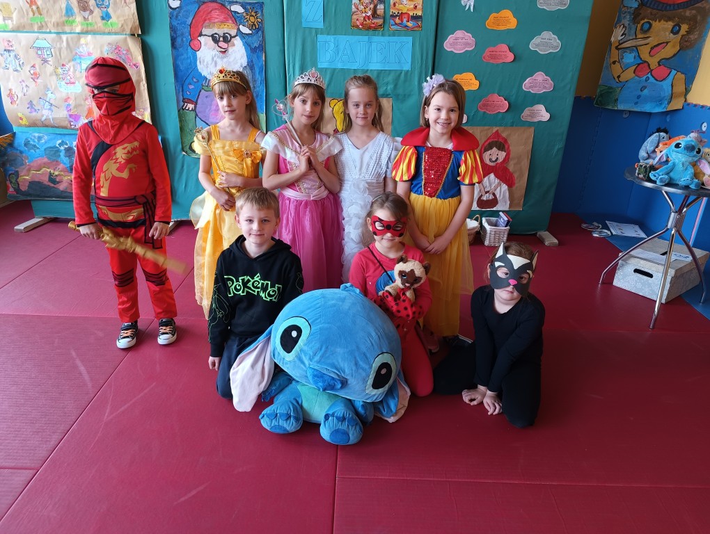 W tym dniu dzieci przyszły przebrane w piękne bajkowe stroje. Wcześniej każda klasa przygotowała plakaty z bajkowymi postaciami, które zawiesiliśmy w sali gimnastycznej. Dla dzieci przygotowano szereg atrakcji. Wśród nich było rozpoznawanie postaci i rekwizytów z bajek oraz odgadywanie zagadek.