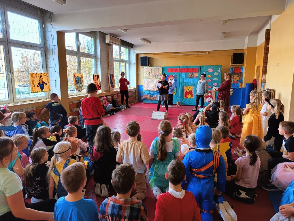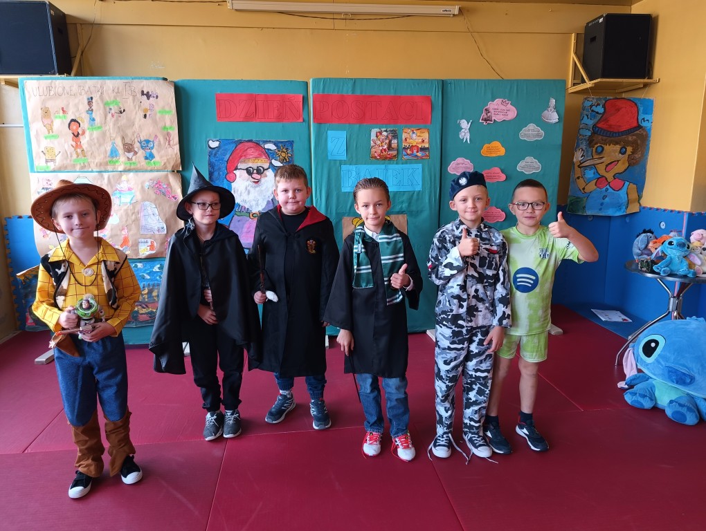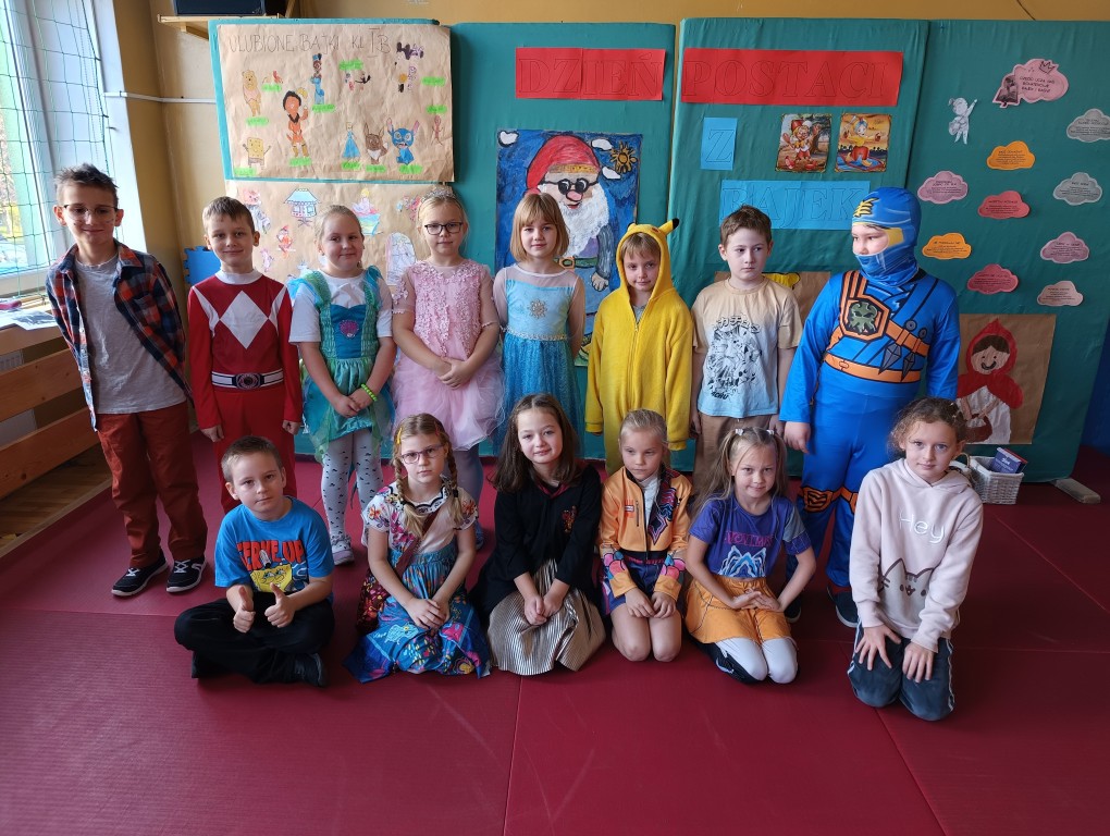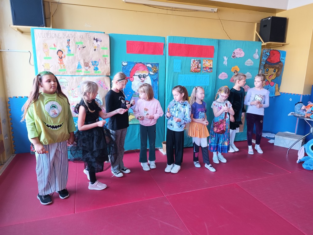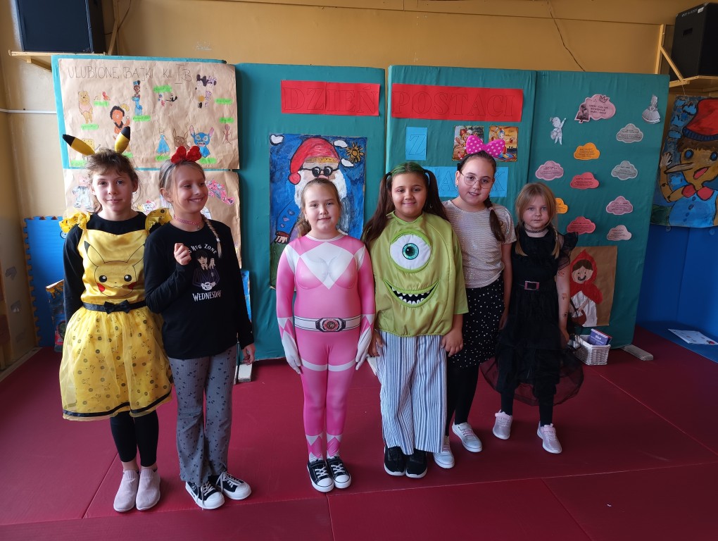 W tym dniu dzieci przyszły przebrane w piękne bajkowe stroje. Wcześniej każda klasa przygotowała plakaty z bajkowymi postaciami, które zawiesiliśmy w sali gimnastycznej. Dla dzieci przygotowano szereg atrakcji. Wśród nich było rozpoznawanie postaci i rekwizytów z bajek oraz odgadywanie zagadek.