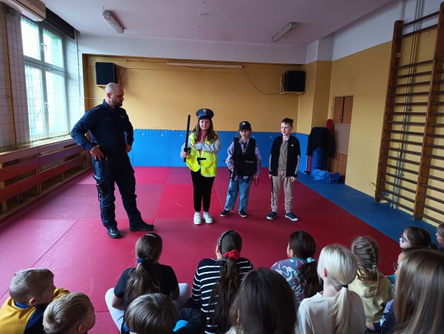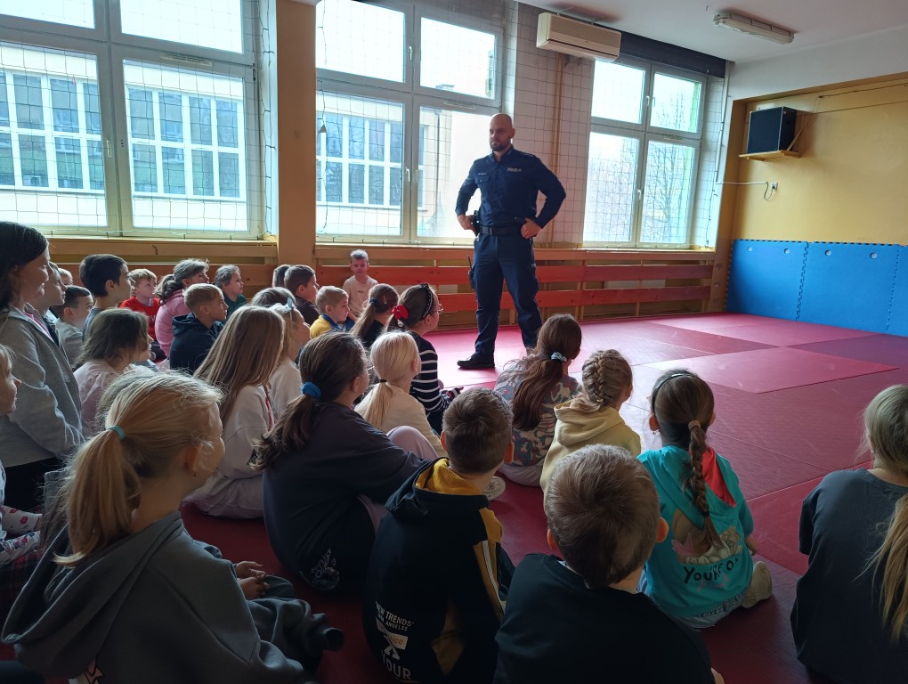 Uczniowie wszystkich klas uczestniczyli w spotkaniu z funkcjonariuszem Policji.