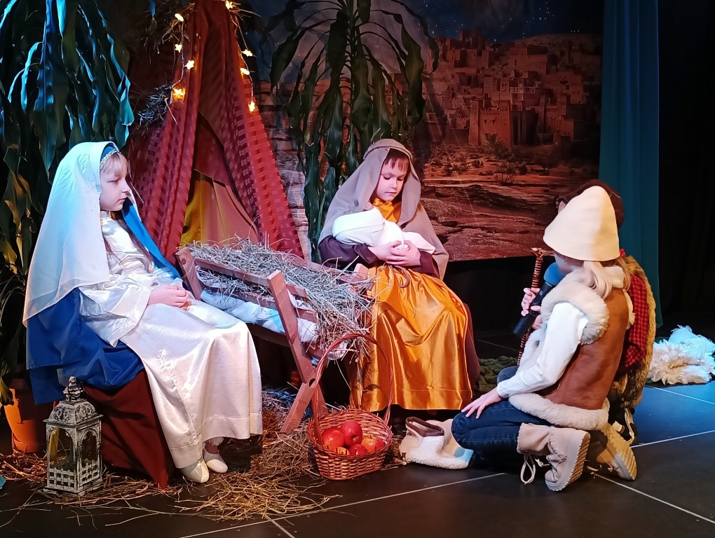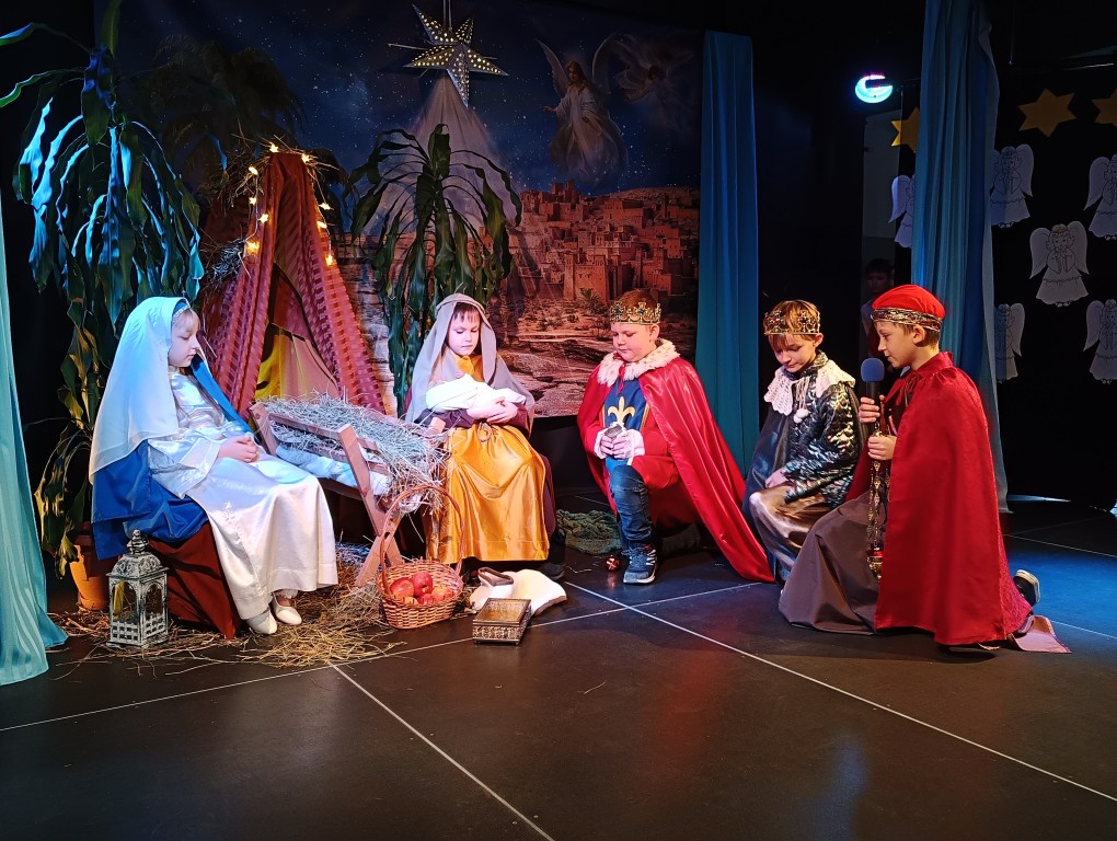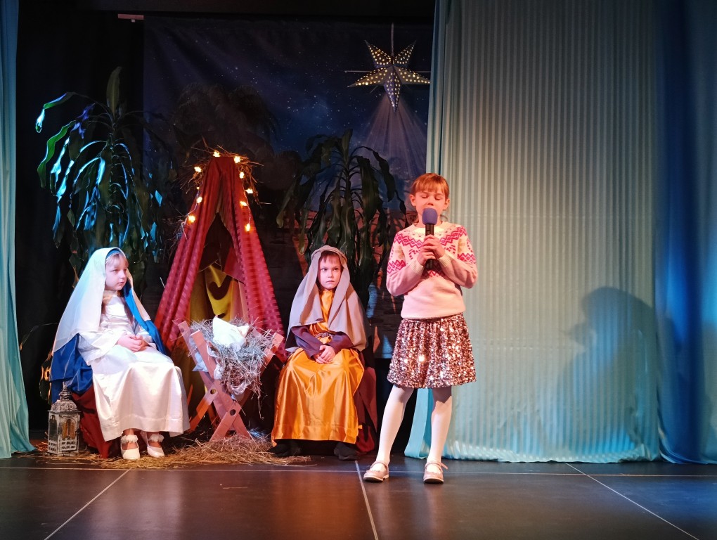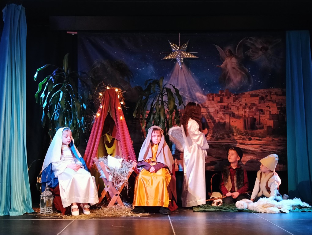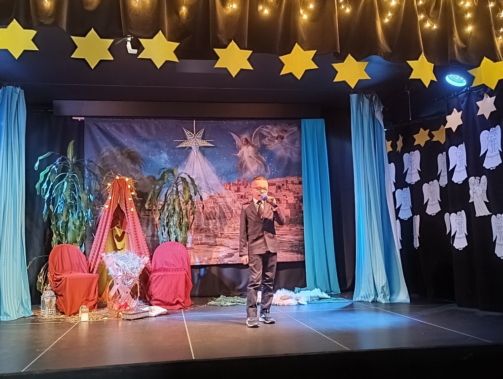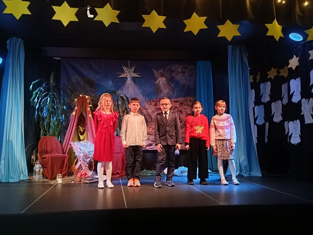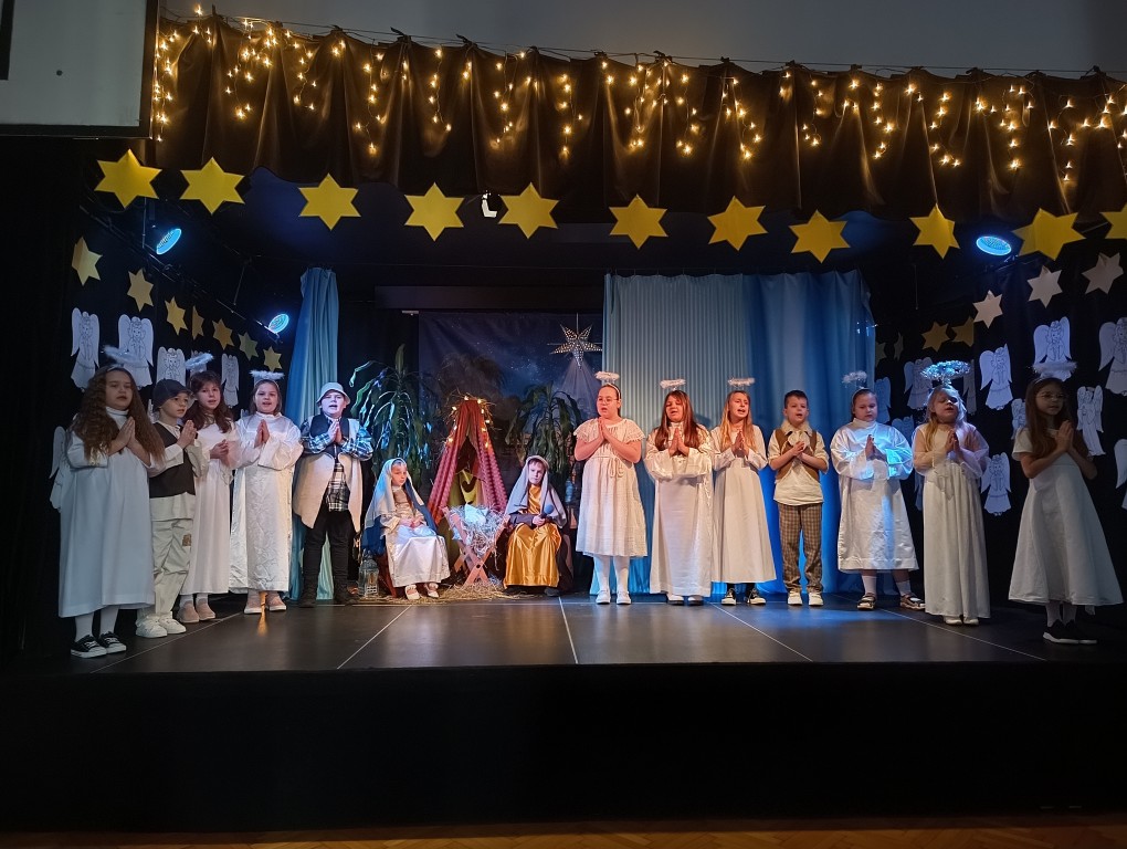 Na szkolnej scenie dzieci z ogromną wrażliwością i zaangażowaniem przedstawiły historię narodzin Chrystusa, tworząc atmosferę pełną ciepła, radości i świątecznego wzruszenia.