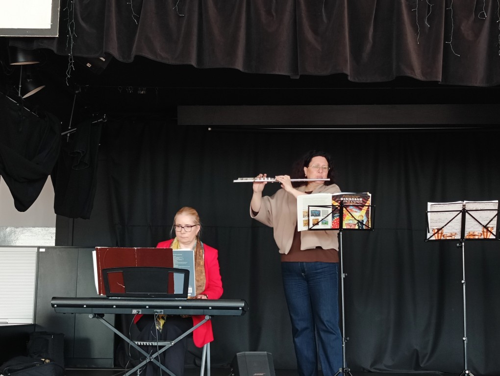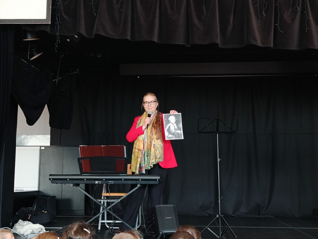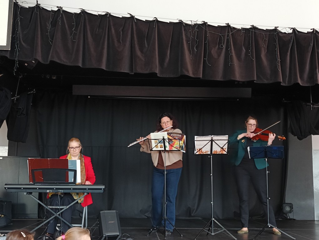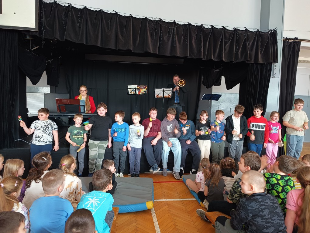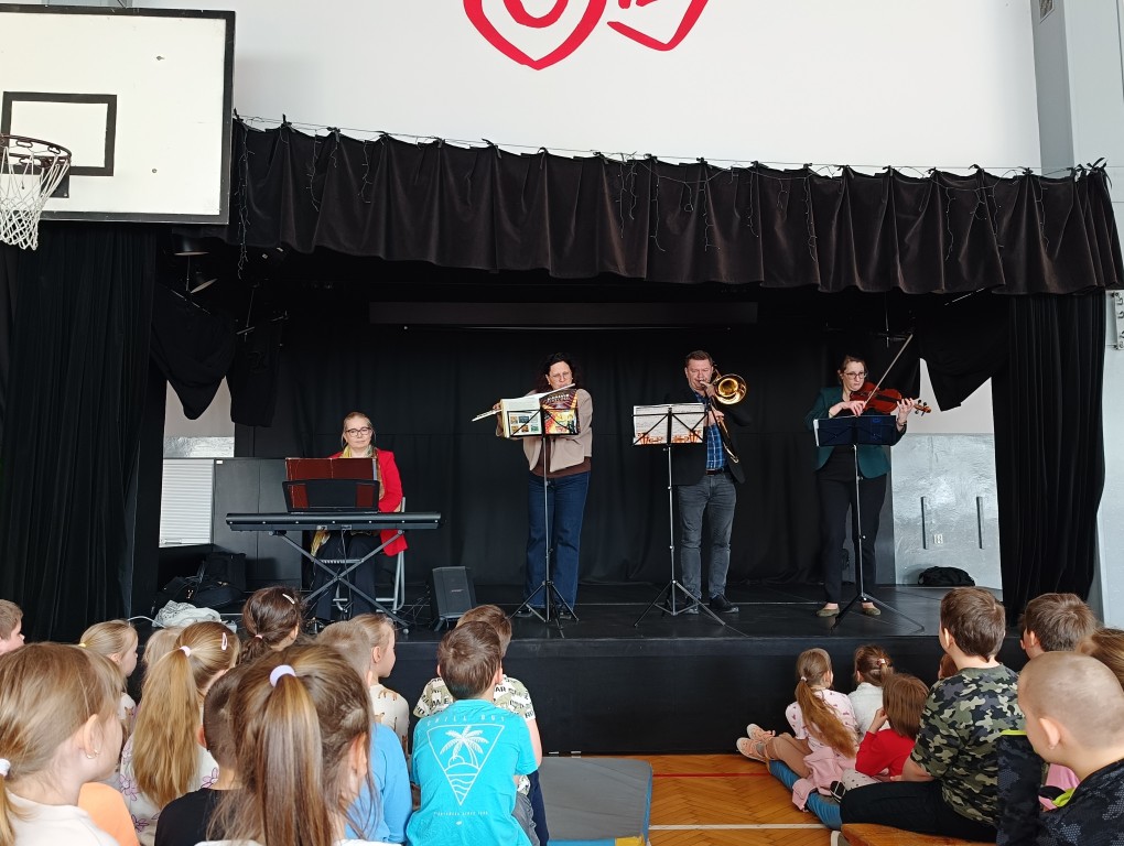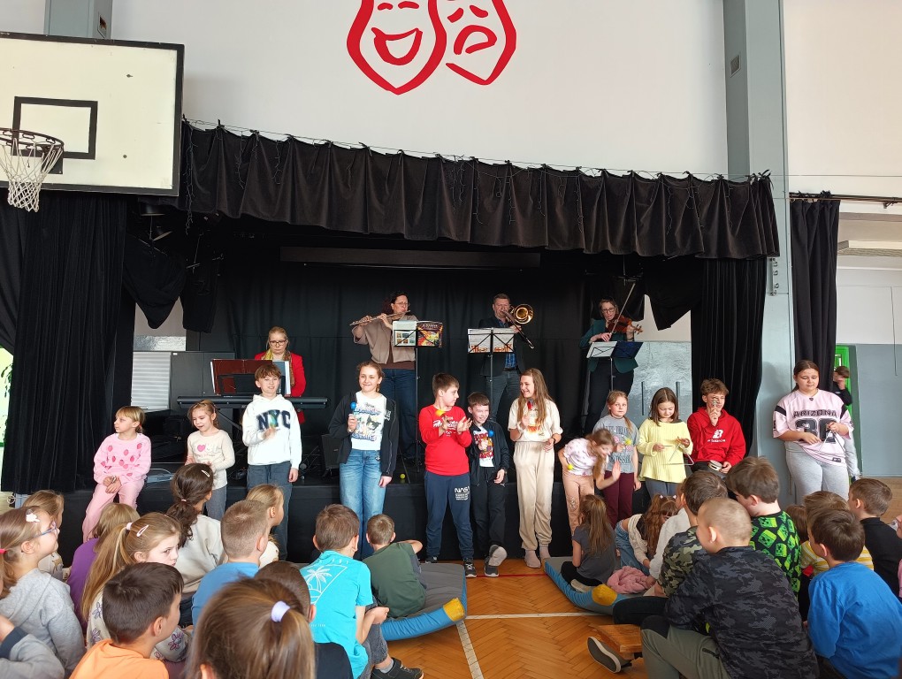 Wysłuchaliśmy pogodnych utworów Mozarta, Haydna i Schuberta, zaprezentowanych przez wykładowców szkół muzycznych z Rybnika i Wodzisławia Śląskiego. Artyści wykonali je z pasją i energią, a dodatkowo zaprosili uczniów do wspólnego akompaniowania na instrumentach perkusyjnych.