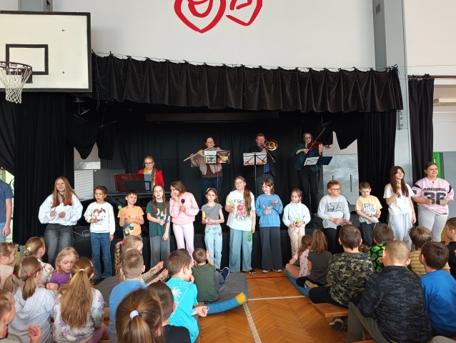 Pozostali uczniowie również aktywnie uczestniczyli w koncercie - wystukiwali rytm na kolanach, pstrykali palcami lub naśladowali brzęczenie pszczół. W sali panowała radosna, wiosenna atmosfera. To był naprawdę udany występ.
